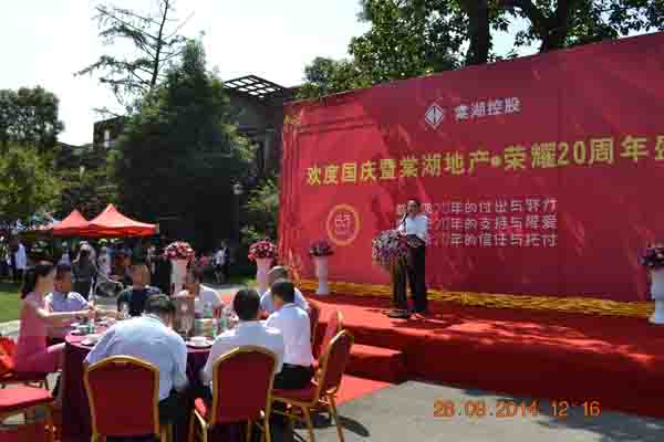 2014年9月28日,棠湖企业20周年暨国庆65周年庆祝纪念活动在棠湖·泊林城现场隆重召开,集团何东总经理主持活动,集团党委书记严统明先生在活动上作了热情洋溢的讲话,严书记在讲话中感谢了先前员工福利房活动中广大员工对集团产品的支持与信任,同时为在场的集团员工、合作企业及相关商会等来宾就棠湖集团发展的过往和未来几年的规划作了说明,同时借集团成立20周年的契机祝愿我们伟大的祖国繁荣昌盛。相信乘着国家发展的东风,棠湖企业必将更上层楼,取得新的更加辉煌的发展和成长。